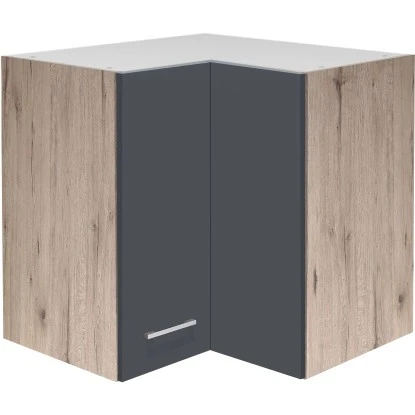 Top-Qualität „Made in Germany“ zum kleinen Preis. Der Eck-Oberschrank überzeugt durch eine geradlinige Formgebung und zeichnet sich durch ein modernes Ambiente aus. Dabei bietet Ihnen der hochwertige Oberschrank ein reizvolles Dekor in der Farbe Basaltgrau kombiniert mit San Remo Eiche und eignet sich optimal als passende Ergänzung zur Küchenserie Morena.