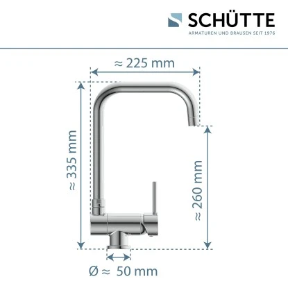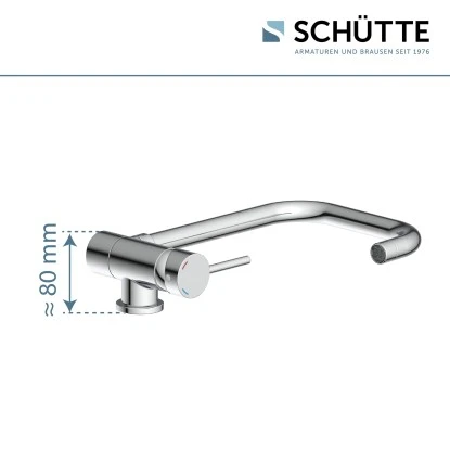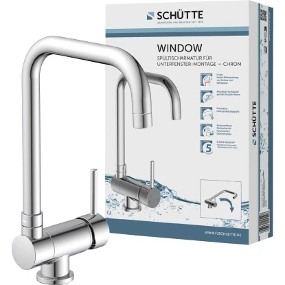 Die Schütte Spülbeckenarmatur Window setzt moderne Akzente in Ihrer Küche und wird zu einem absoluten Hingucker. Die Standarmatur mit hohem Bogenauslauf und 360° Schwenkbereich sorgt für einen komfortablen Aktionsradius. Dank der Einhebel-Bedienung haben Sie mehr Bewegungsfreiheit am Spülbereich. Die Hochdruck-Armatur ist mit einer geräuscharmen, auswechselbaren Kartusche mit langlebigen, keramischen Dichtungen ausgestattet. So gelingt die präzise Regelung der Durchflussmenge und der Wassertemperatur. Dank der Cold-Start-Funktion wird bei Hebel-Mittelstellung nur der Zufluss von Kaltwasser ermöglicht und Sie sparen Energie. Zudem verfügt die Armatur über einen Kalt- und einen Warmwasseranschluss und wird inklusive zwei Flexschläuche geliefert. Strenge Qualitätskontrollen und hochwertige Materialien, die den Bestimmungen der deutschen Trinkwasserverordnung entsprechen, garantieren hohe Sicherheit und beste Wasserqualität. Dank des mitgelieferte Montagesets und der leicht verständlichen Montageanleitung gelingt die Installation im Handumdrehen. Mit dem umklappbaren Auslauf eignet sich die Armatur ideal zur Montage unter dem Fenster.