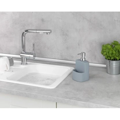 Der Wenko Spülmittelspender Festival mit griffiger Soft-Touch Oberfläche Grau setzt dezente Akzente in modernem Grau. Die hochglanzverchromte Kunststoffpumpe kombiniert mit der gummierten Keramik (Soft-Touch Keramik) sorgt für ein exklusives Ambiente in jeder Küche. Der dekorative Seifenspender kann individuell mit bis zu ca. 380 ml Spülmittel gefüllt werden. Durch leichten Druck auf den Dosierknopf wird die gewünschte Menge Spülmittel herausgepumpt. Praktisch ist die integrierte Aufbewahrungsmöglichkeit für einen Spülschwamm.
